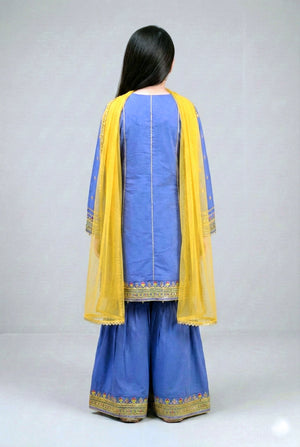 Make your little girl shine in this Premium Embroidered Kids Angrakha Frock Suit, designed for festive events, weddings, mehndi functions, and special occasions. Crafted in a beautiful royal blue shade, this traditional outfit features a fully embroidered angrakha-style frock, paired with a stylish gharara and a soft yellow net dupatta for the perfect cultural look.